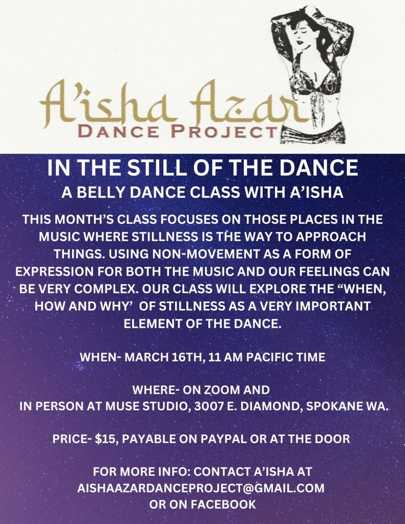A’ISHA AZAR DANCE PROJECT- We have classes on a monthly basis . They are offered online with a few in person spaces available. The class dates will be announced here and in the Schedule part of this website as well as on an Events page on Facebook.